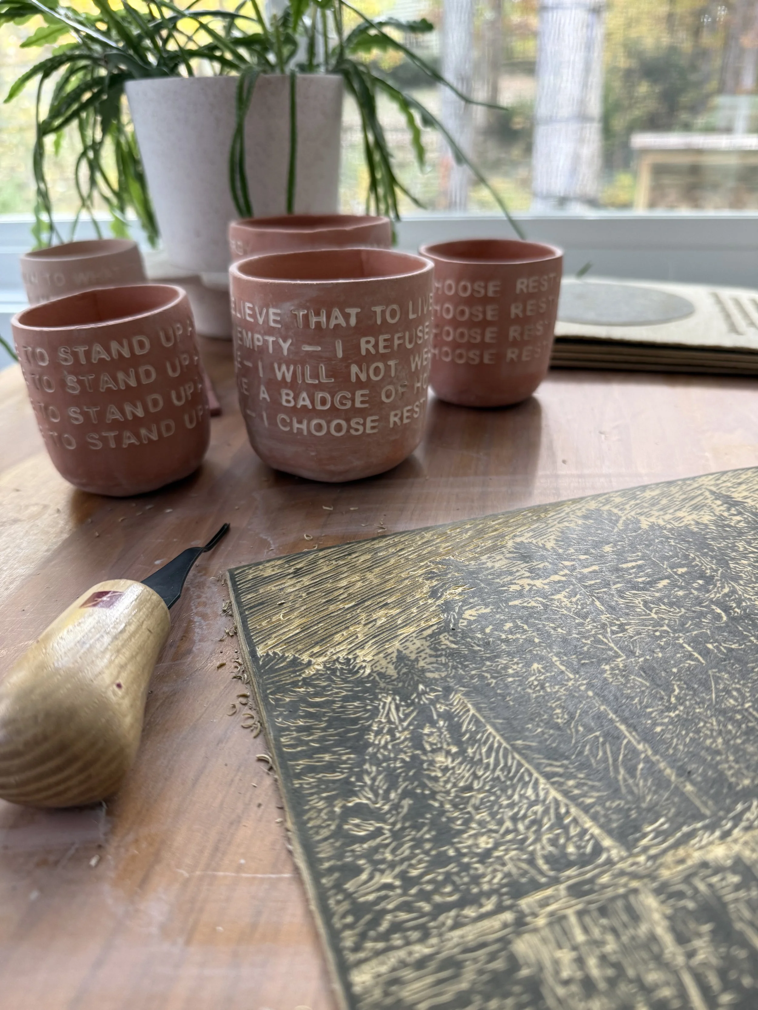Hand-carved linocuts and hand-built ceramics made in the rhythm of rest, created as a gentle reminder that sanctuary can be found, even here.