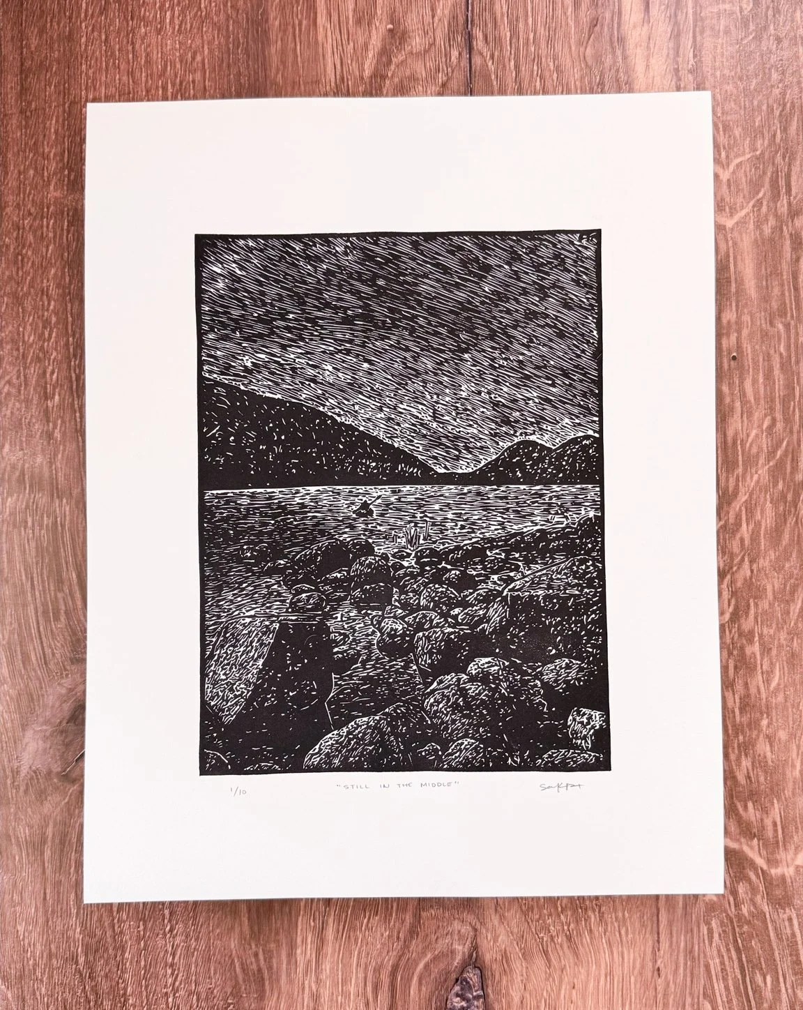 Each print in The Sanctuary Collection is carved by hand from a block of linoleum, inked, and printed, one at a time, allowing small variations that make each print unique.