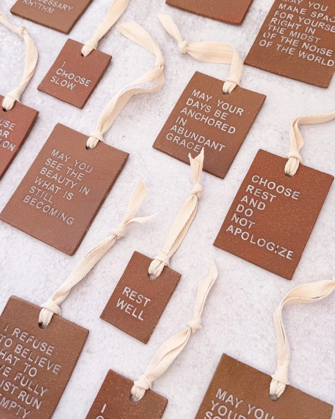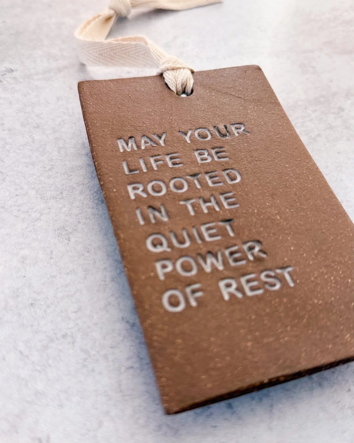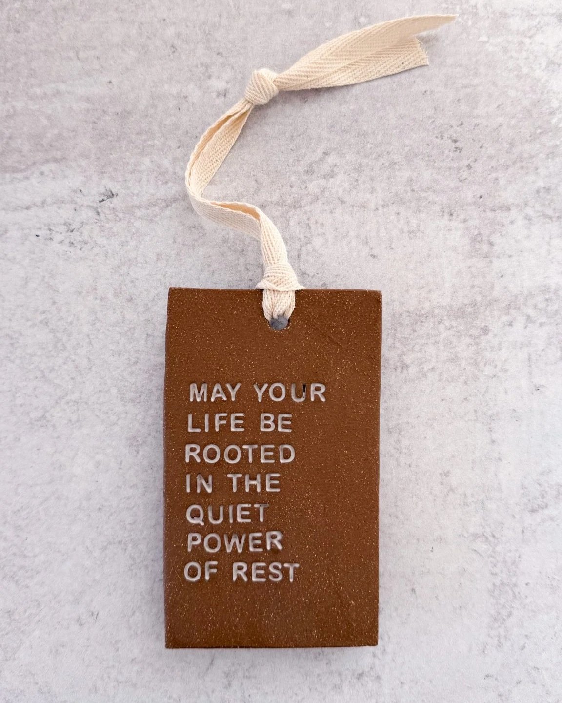 Each ornament is hand-built and stamped letter by letter, then each letter is finished in glaze. The words impressed into each piece invite pause and reflection, a small sanctuary to carry in your heart and in your hands.