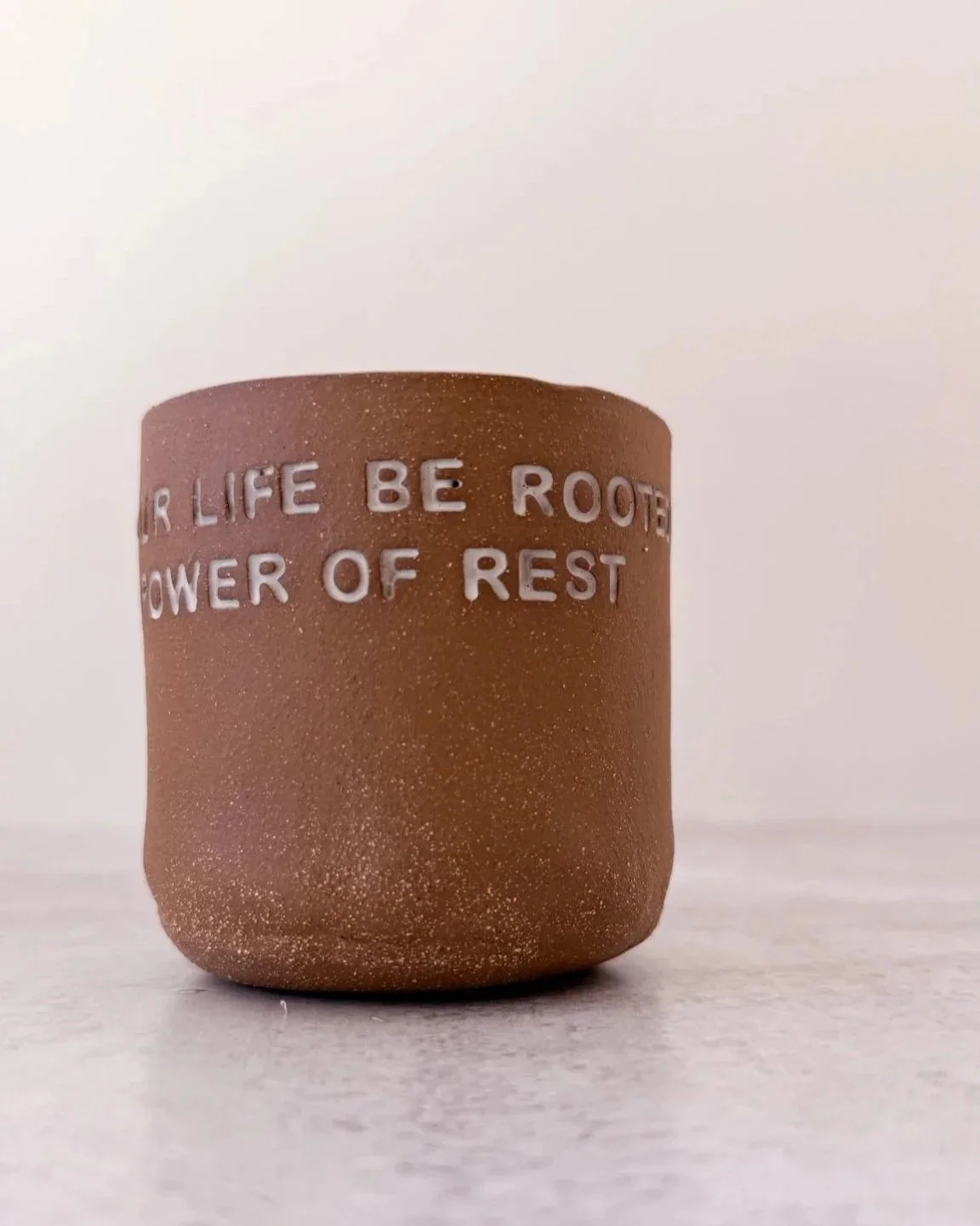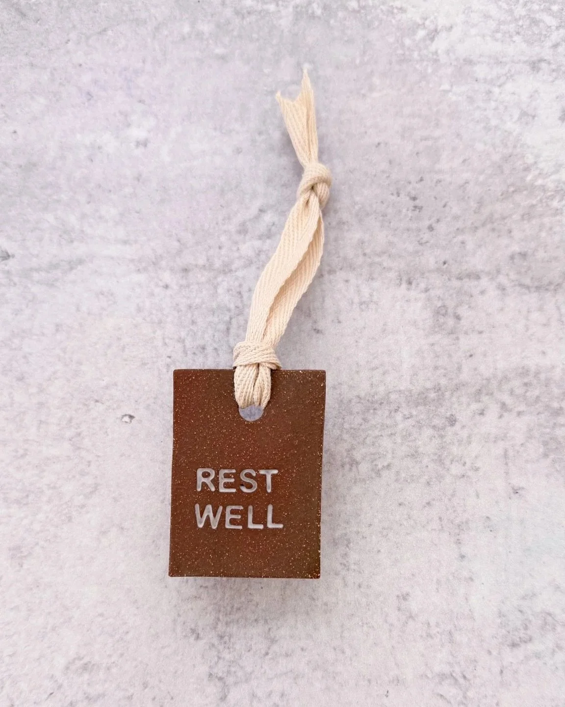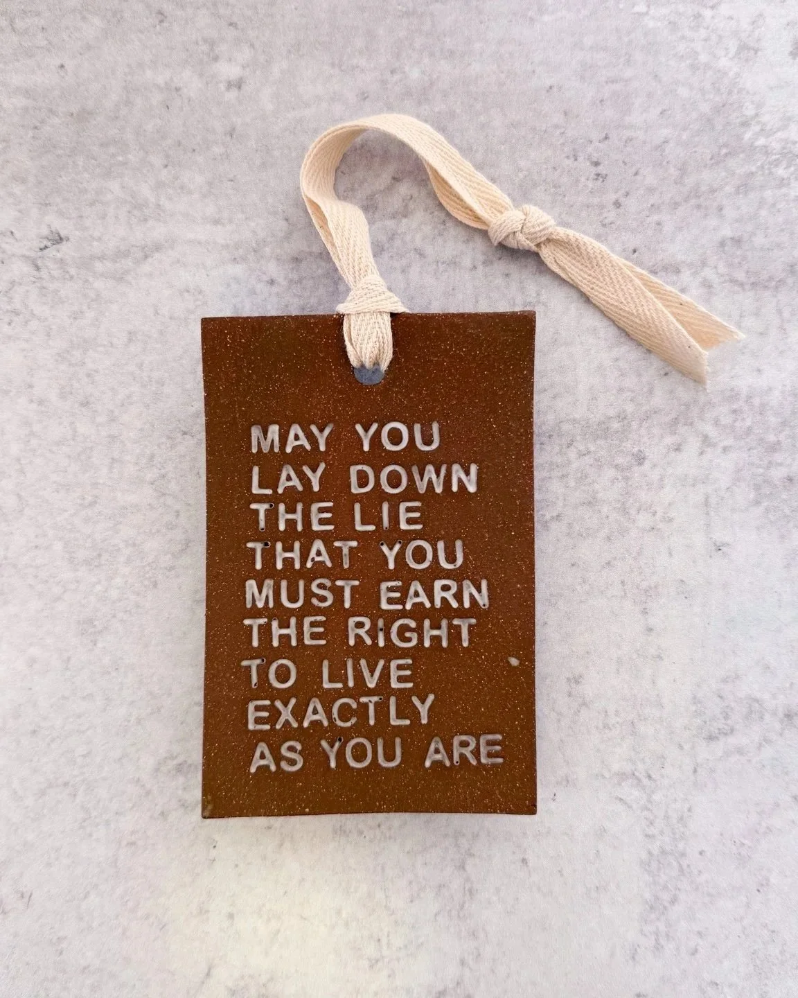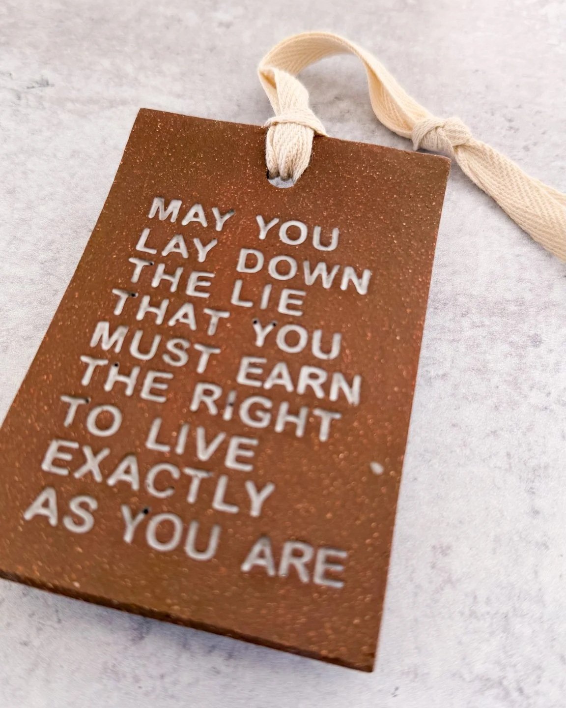 Each ornament is hand-built and stamped letter by letter, then each letter is finished in glaze. The words impressed into each piece invite pause and reflection, a small sanctuary to carry in your heart and in your hands.