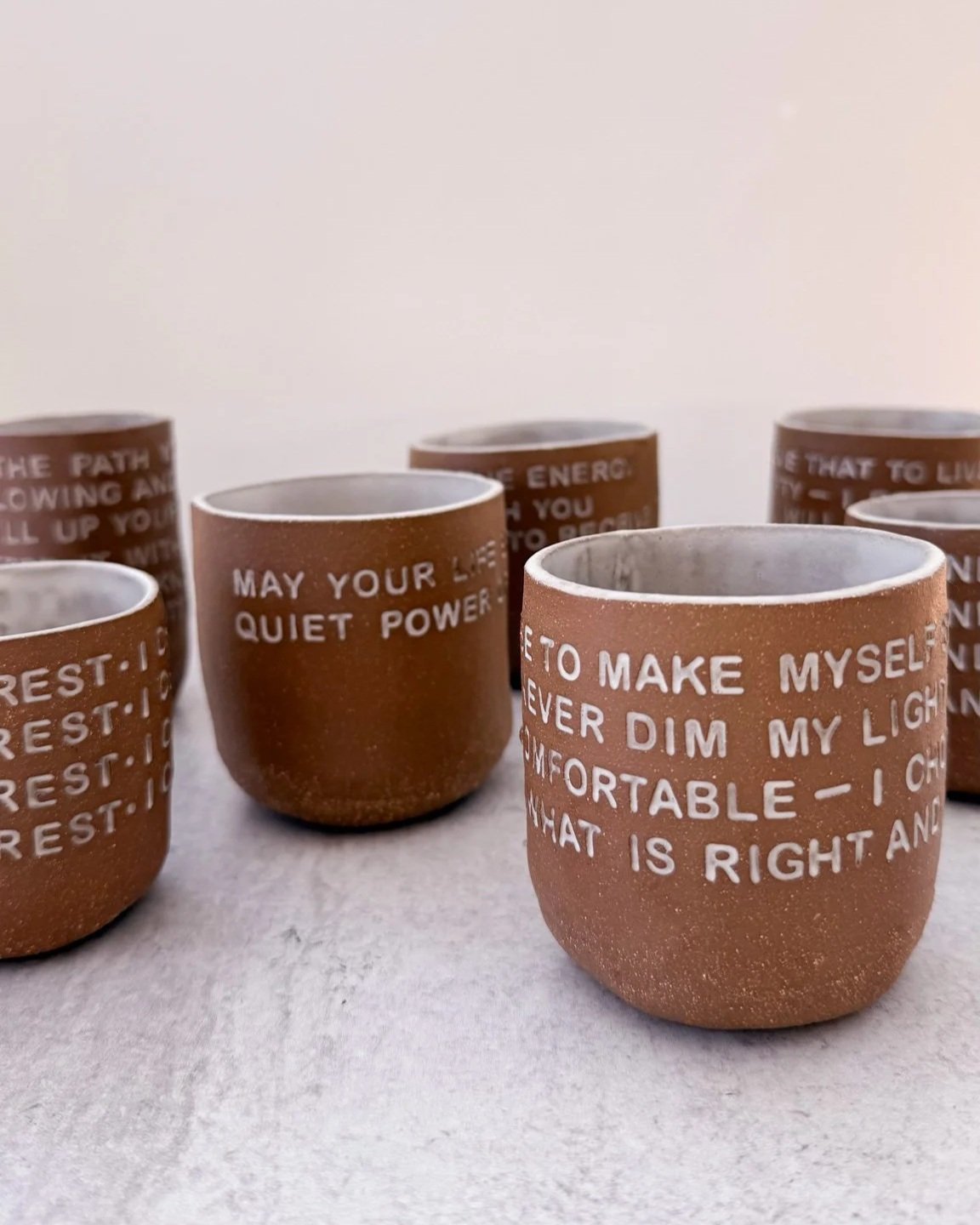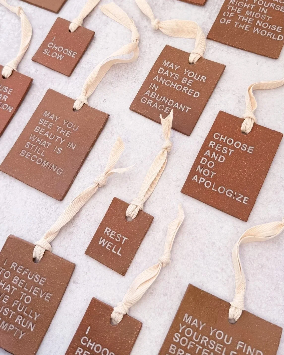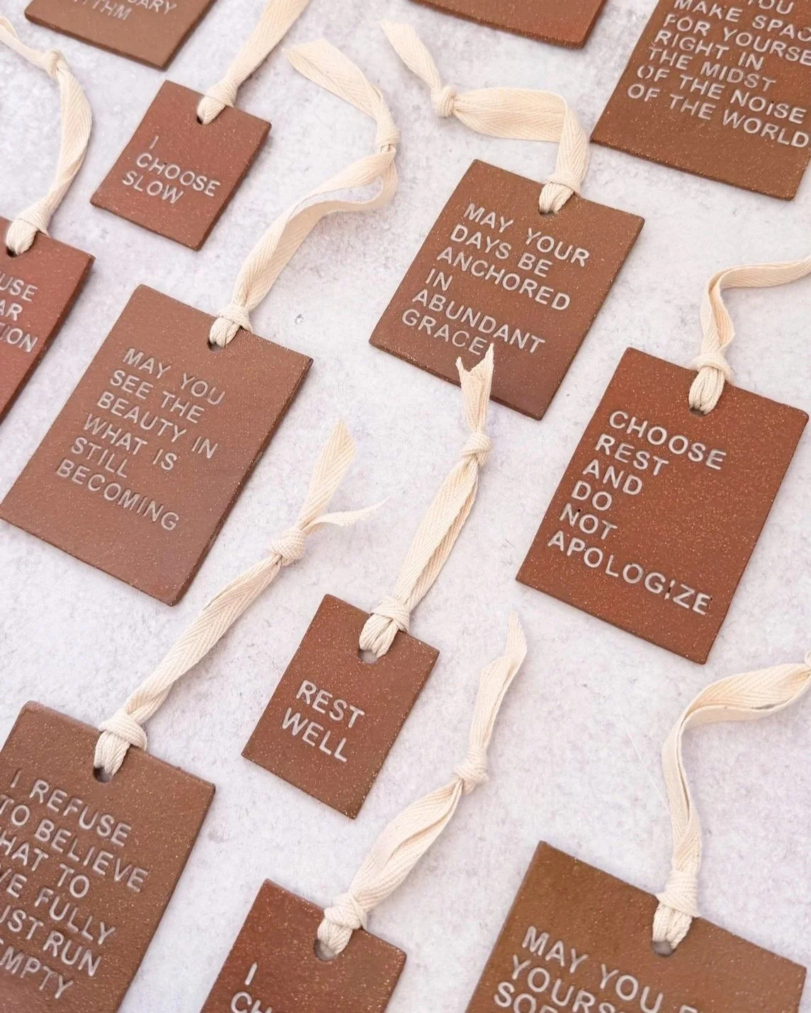 Each ornament is hand-built and stamped letter by letter, then each letter is finished in glaze. The words impressed into each piece invite pause and reflection, a small sanctuary to carry in your heart and in your hands.