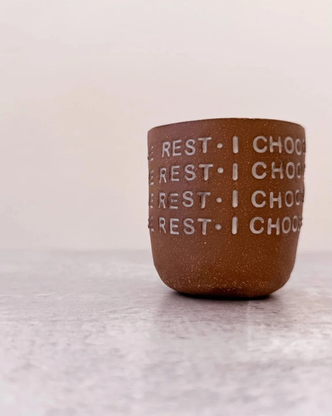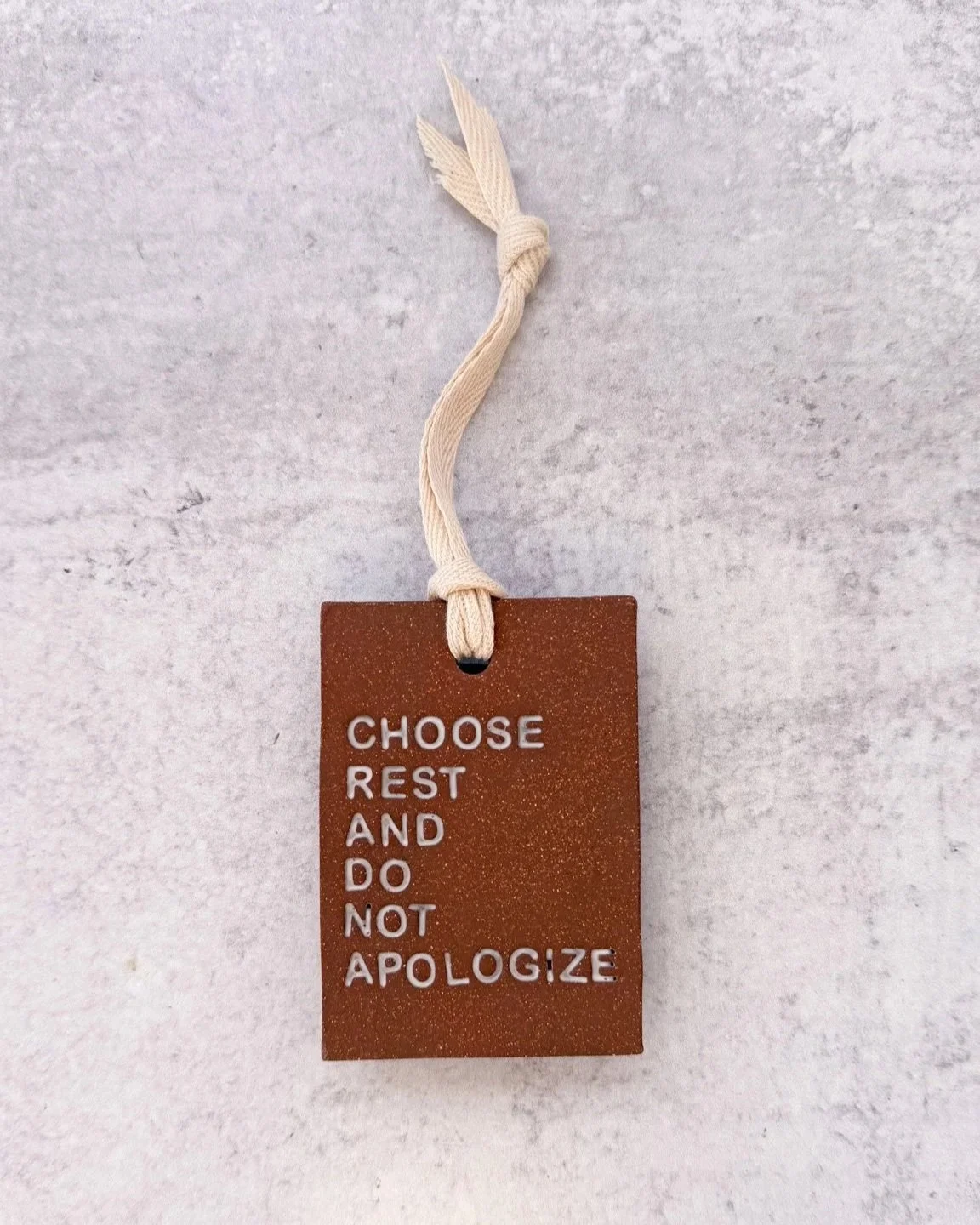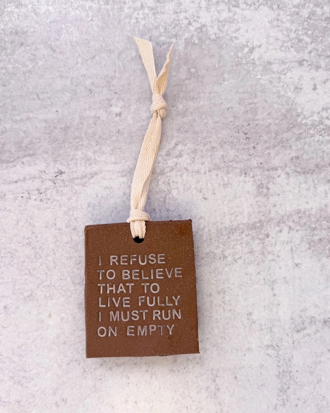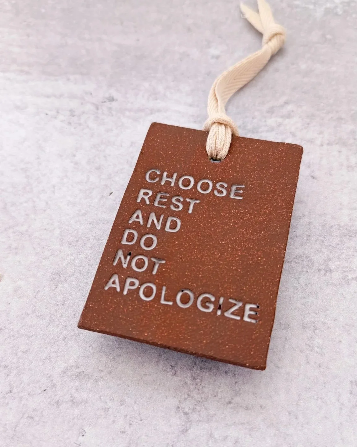 Each ornament is hand-built and stamped letter by letter, then each letter is finished in glaze. The words impressed into each piece invite pause and reflection, a small sanctuary to carry in your heart and in your hands.