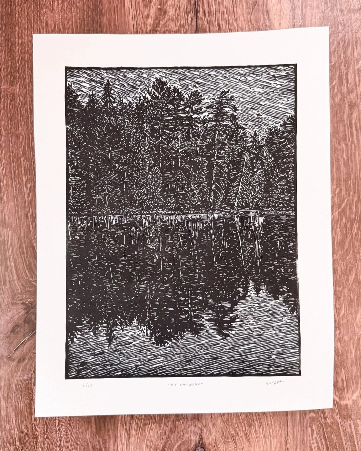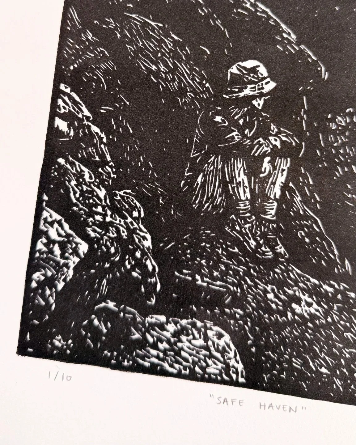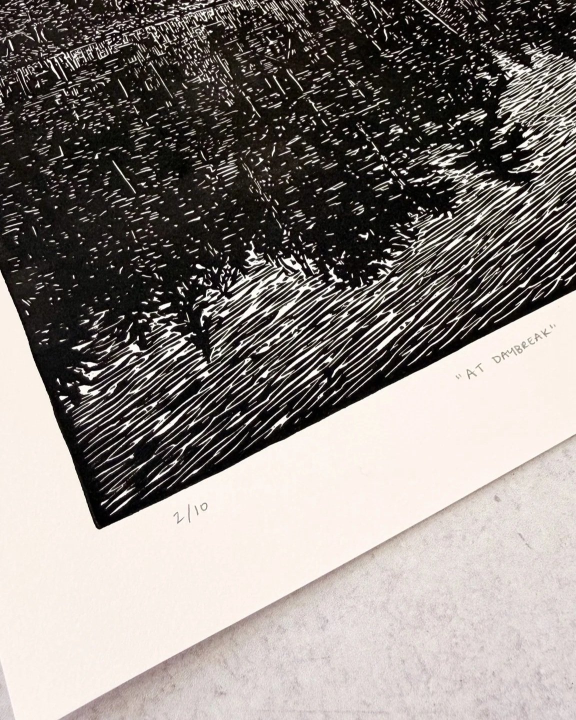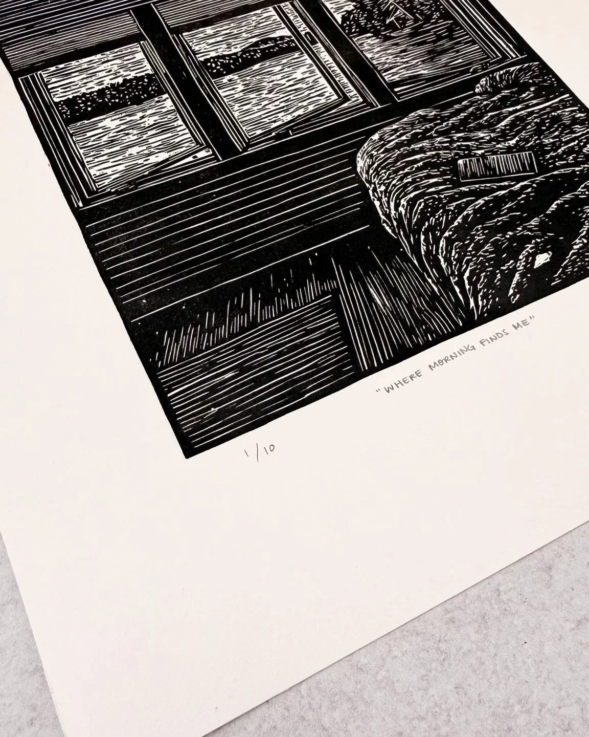 Each print in The Sanctuary Collection is carved by hand from a block of linoleum, inked, and hand-printed, allowing small variations that make each print unique.